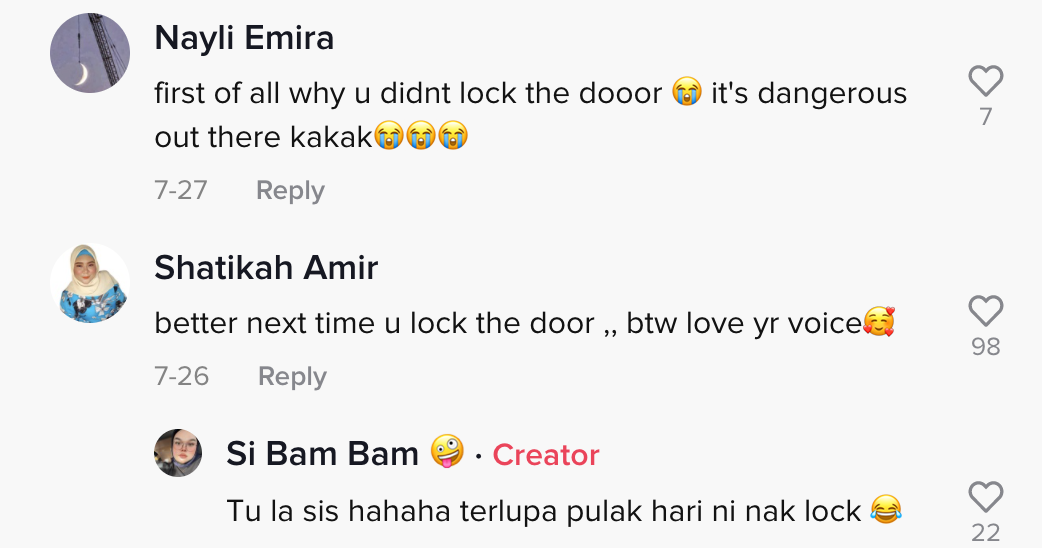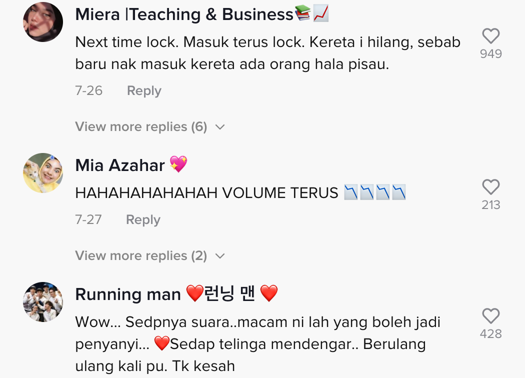 Sementara itu, tinjauan di ruangan komen mendapati rata-rata netizen ramai memuji kemerduan suaranya. Malah, ada juga yang menasihatkannya agar lebih berhati-hati dan sentiasa kunci pintu apabila seorang diri.