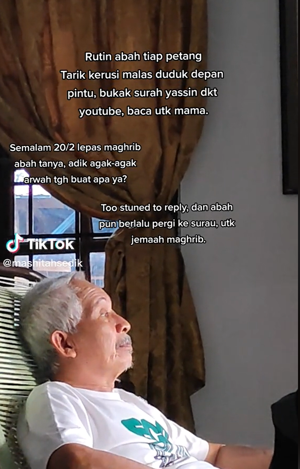 Dalam video tersebut, ayahnya sering membaca surah Yasin untuk ibunya sambil duduk di atas kerusi malas di hadapan pintu setiap petang.