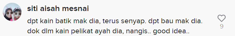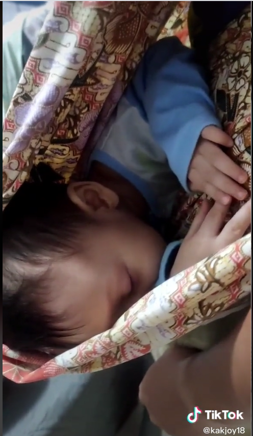 Namun selepas itu, si bapa menggunakan caranya tersendiri dengan meletakkan anak mereka di dalam kain batik si ibu. Dia kemudian cuba mendodoikan anaknya itu dan kanak-kanak itu tidak menangis dan mahu tertidur.