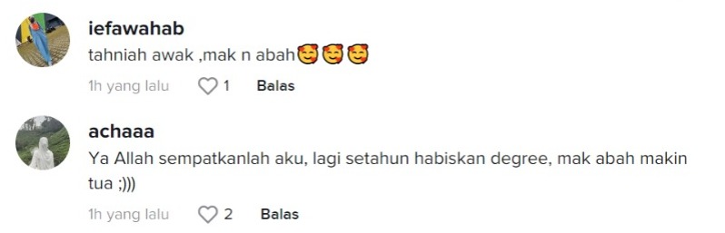 "Alhamdulillah masih diberi peluang untuk hadiahkan mak abah sebuah kejayaan, tapi masih jauh perjalanan untuk aku bahagiakan mak abah. Umur mak abah dah larut, aku anak bongsu, masih tak cukup lagi untuk aku balas jasa mak abah. Doa kan. Terima kasih untuk semua nya," katanya.