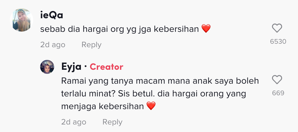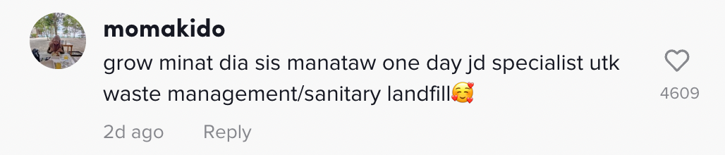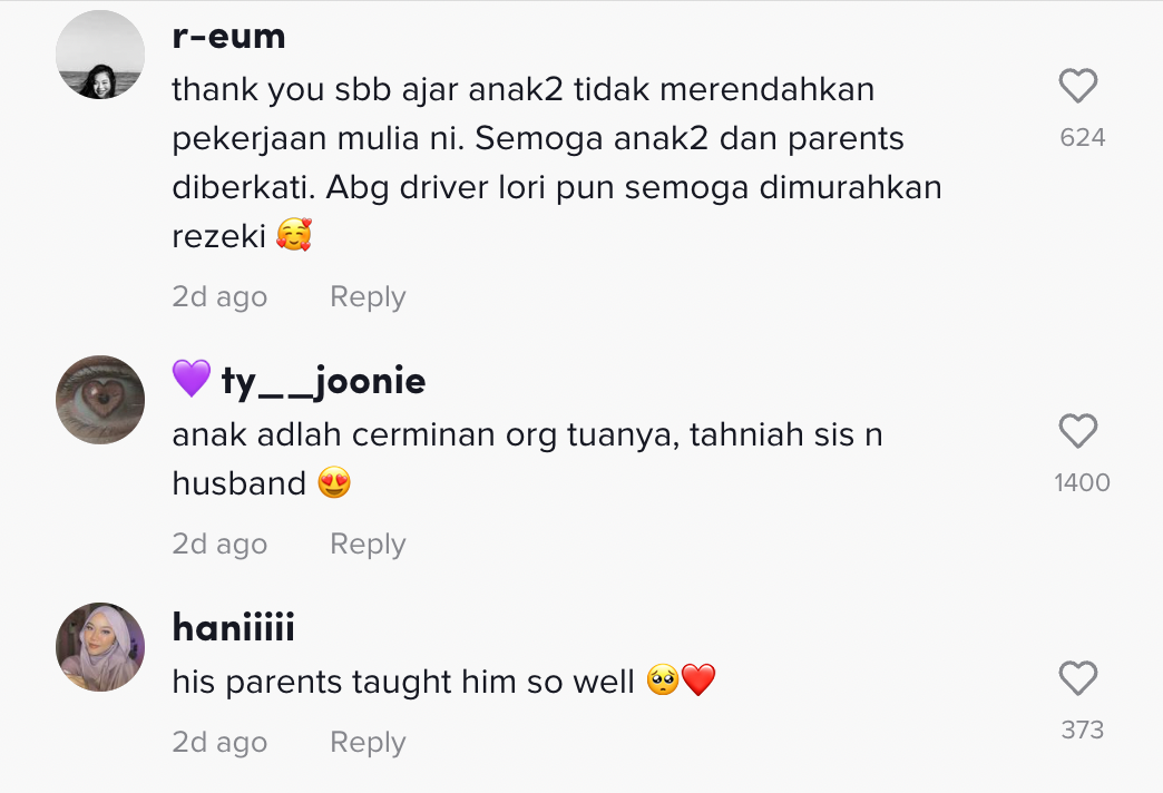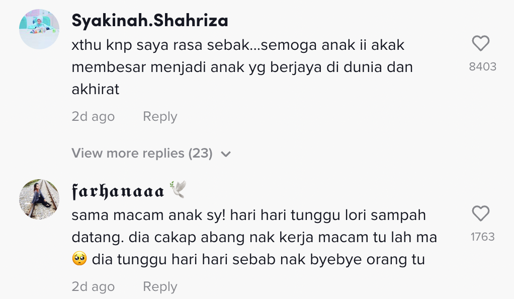Menurutnya, ia adalah satu kerja yang baik kerana menjaga alam sekitar. Malah, difahamkan setiap kali dia terjumpa dengan pekerja tersebut, dia akan mengucapkan terima kasih dan meluah untuk menjadi seperti mereka apabila sudah dewasa nanti.