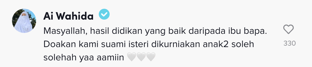 "Didikan mak ayahnya sangat hebat, semoga menjadi anak yang soleh solehah ya" – Netizen