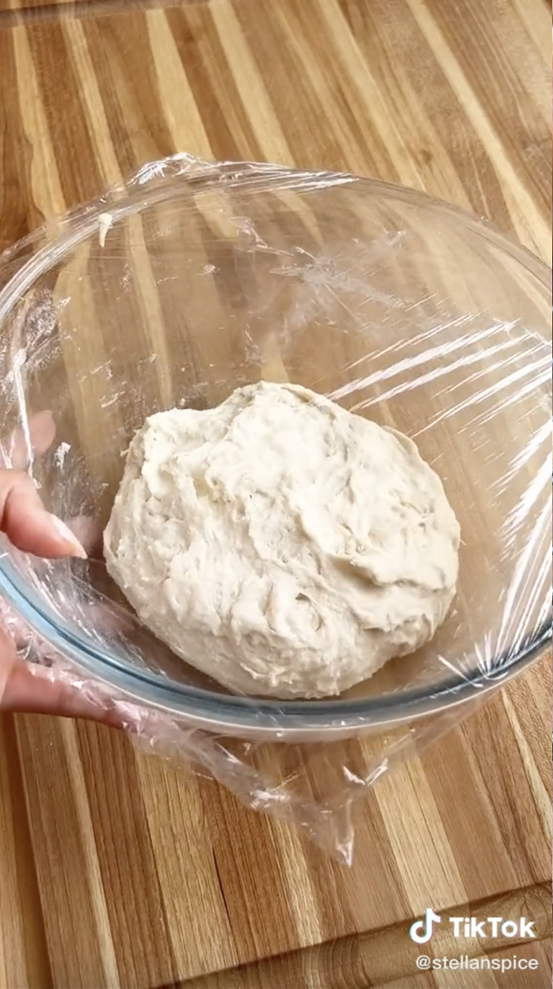 4. Selepas 1 jam, doh anda akan kembang dan naik. Tumbuk atau cucuk doh untuk keluarkan angin dan pastikan teksturnya melekat. Tutup dan biarkan lagi selama 30 minit.