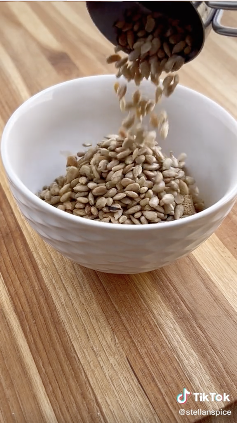 6. Sediakan satu mangkuk kecil dan masukkan 2/3 cawan gula perang, 1 sudu kecil serbuk cinnamon dan 1/3 cawan kuaci.