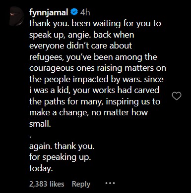 Salah satunya adalah Fynn Jamal yang berterima kasih kepada artis Hollywood itu kerana menggunakan pengaruhnya untuk memberi kesedaran kepada dunia terhadap apa yang berlaku di Palestin.