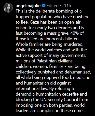 "Dengan enggan menuntut gencatan senjata dan menyekat Majlis Keselamatan PBB daripada memihak antara salah satu daripada kedua-dua pihak, pemimpin juga dunia terlibat dalam jenayah ini," katanya menerusi kapsyen pada hantaran Instagram tersebut.