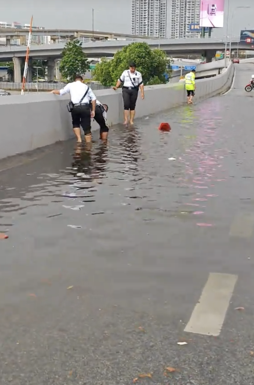 Menerusi video di TikTok, kelihatan anggota polis itu membantu membersihkan satu laluan jalan raya di sekitar ibu negara yang dinaiki air.