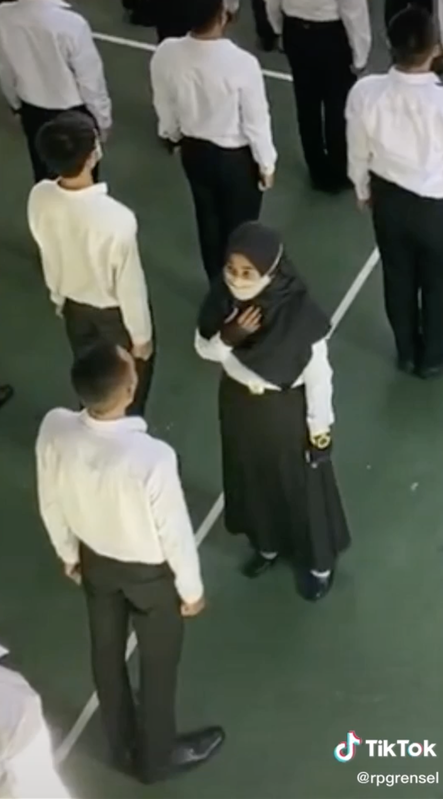 Namun, apabila semua sedang fokus mendengar arahan dan diminta untuk pusing ke depan, gadis itu dilihat tiba-tiba terpusing ke arah berlainan sehingga berdepan dengan seorang lelaki.