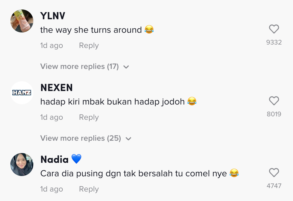 Situasi itu membuatkan dia merasa malu dan terus pusing ke arah yang betul. Malah, cara pusingan gadis itu juga menjadi perhatian.