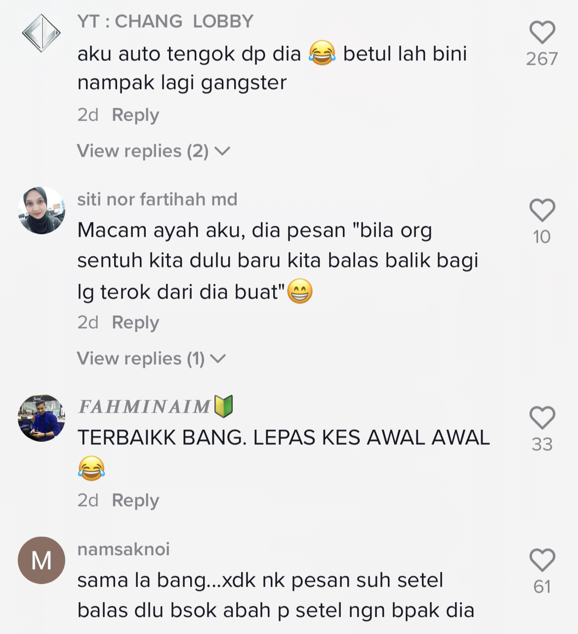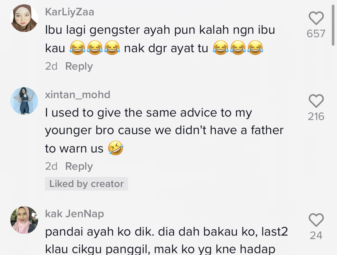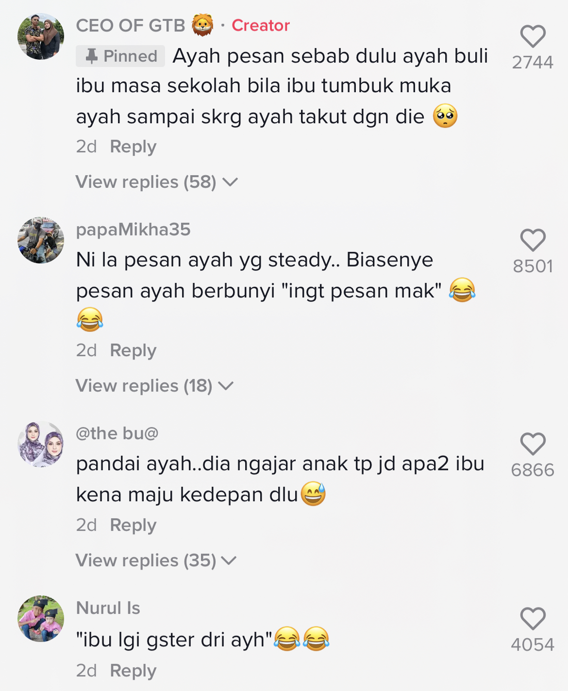 Susulan tularnya video itu yang kini meraih sehingga 1.9M tontonan, 183.6K tanda suka dan 4.2K komen di TikTok, rata-rata netizen turut terhibur mendengar lelaki tersebut memberi nasihat kepada anak-anaknya.