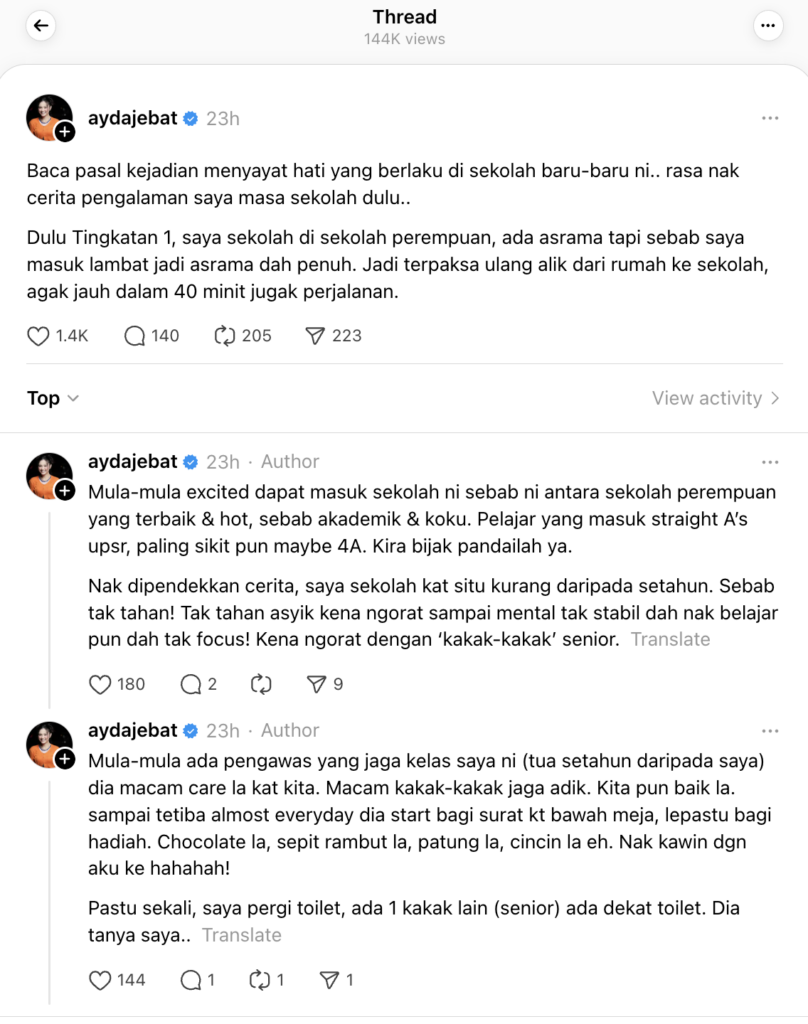 Image via @aydajebat (Threads)Minta tukarkan sekolah, beritahu pengetua hal sebenar