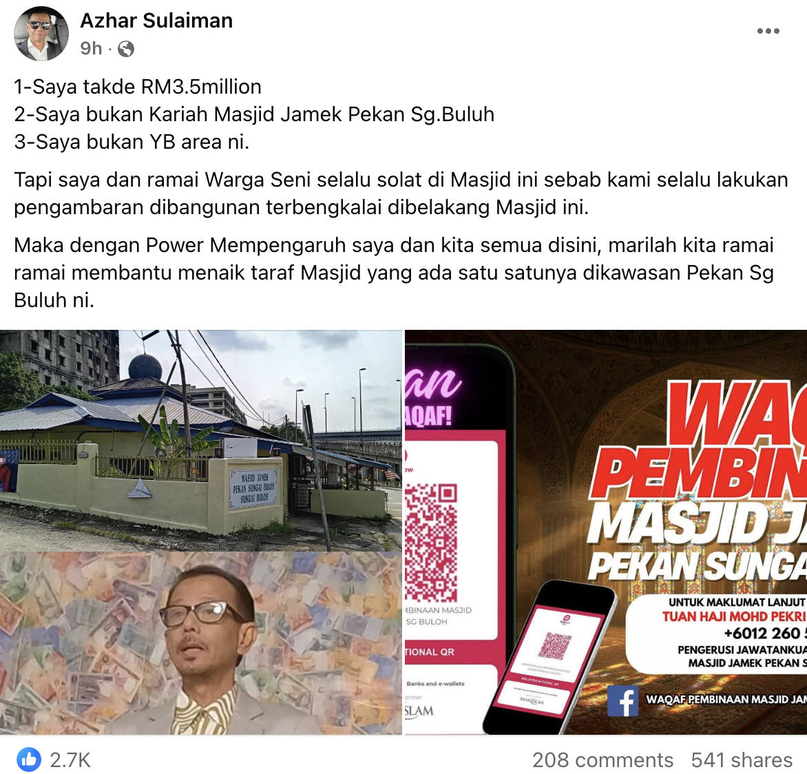 Menerusi hantaran di Facebook Azhar Sulaiman, beliau telah menyeru agar orang ramai dapat membantu menaik taraf Masjid satu-satunya dikawasan Pekan Sungai Buloh itu.