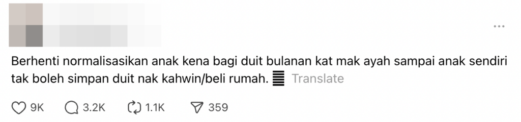 Bagi pemilik hantaran tersebut, dia berpendapat bahawa tekanan sosial untuk memberi wang bulanan secara tetap terutamanya dalam jumlah yang besar sering kali menyebabkan anak-anak muda gagal membina aset penting seperti kediaman sendiri atau mengumpul kos perkahwinan.
