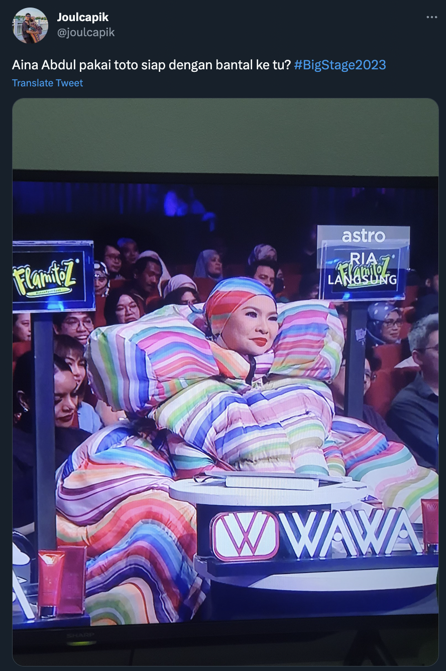 Menerusi ciapan tersebut, dapat dilihat seorang pengguna Twitter berkongsi gambar Aina Abdul. Dia kemudian mempersoalkan pakaian penyanyi tersebut dengan menulis "Aina Abdul pakai toto siap dengan bantal ke tu?," tulisnya.