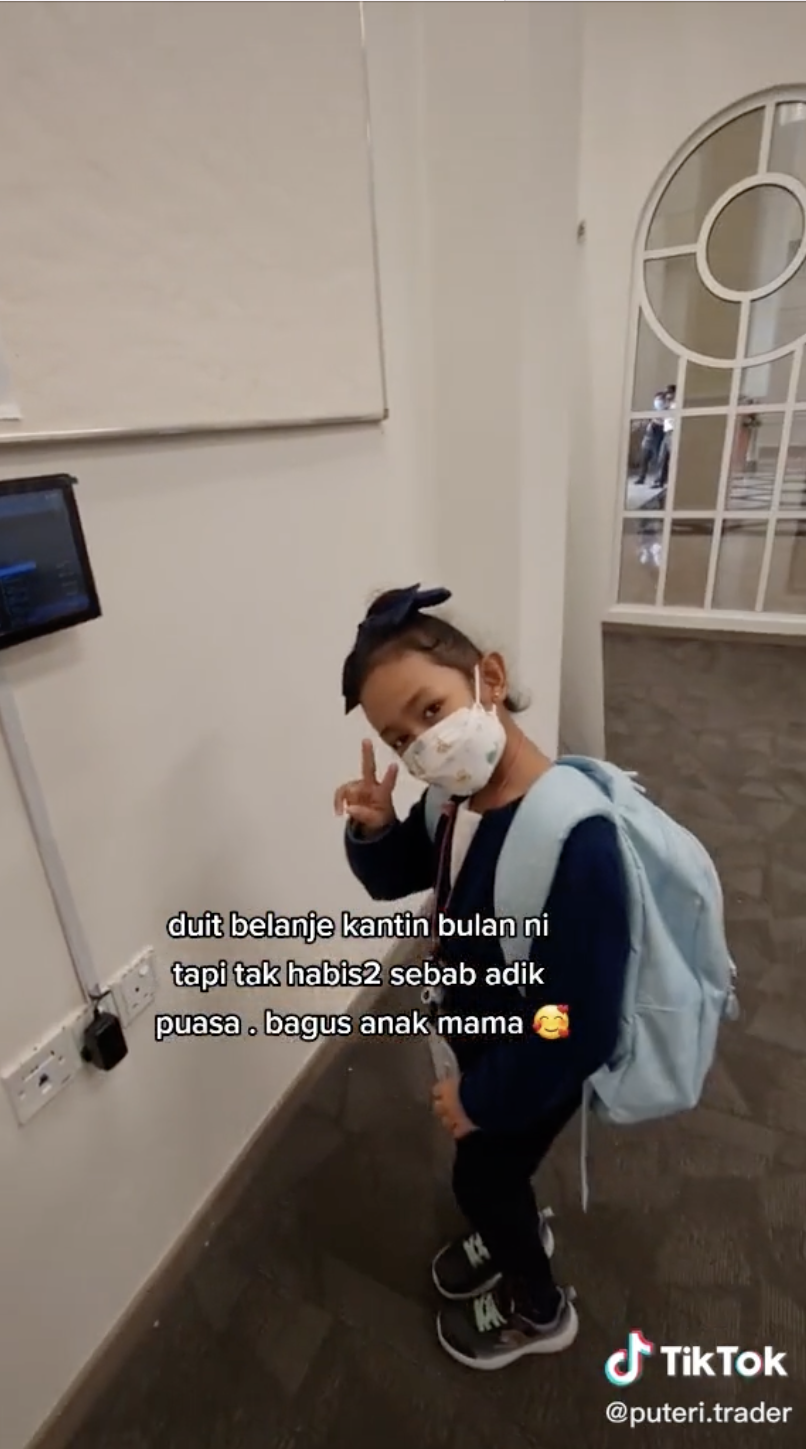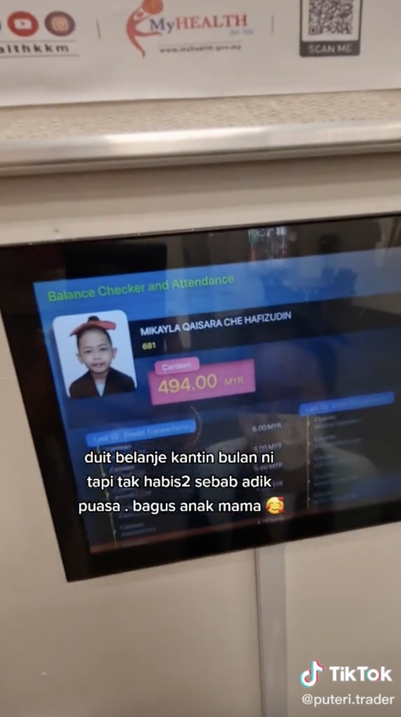Menerusi video yang dimuat naik oleh @puteri.trader di TikTok, kelihatan seorang budak perempuan sedang mengimbas kad pelajarnya untuk menunjukkan baki duit belanjanya.