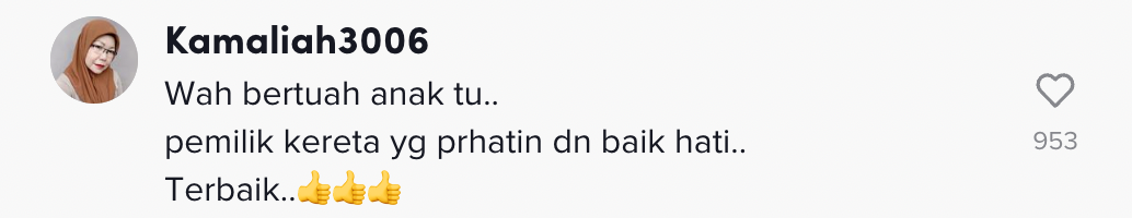Sementara itu, tinjauan di ruangan komen mendapati rata-rata netizen turut memuji sikap pemilik kereta tersebut.