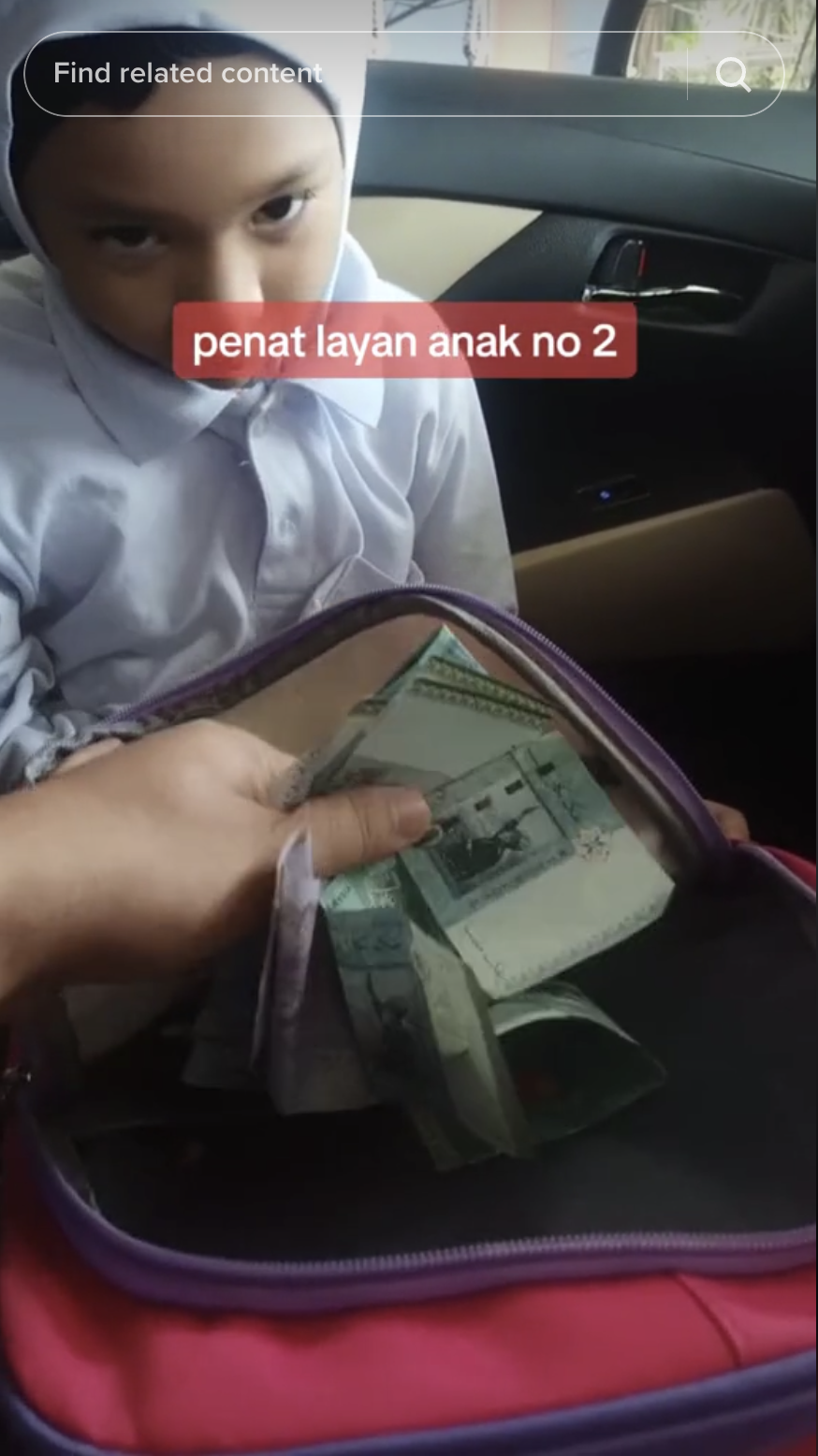 Semua duit itu dilihat diletakkan di dalam beg sekolah baru yang dibeli si ayah. Namun, apa yang membuat si ayah geram adalah difahamkan anaknya itu telah mengambil wang ayahnya berjumlah RM1,500 dan dibawa ke sekolah.
