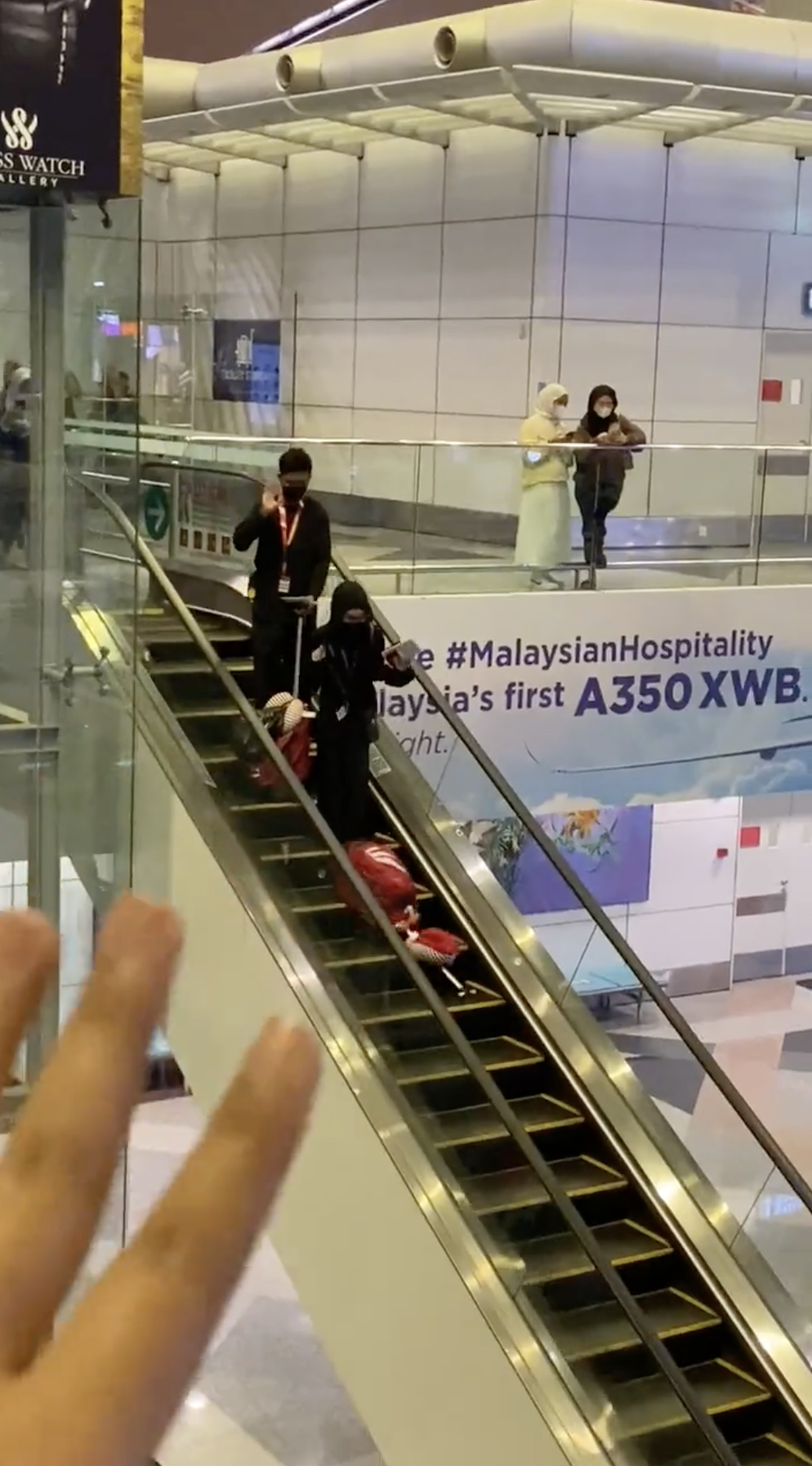 Namun, semasa adiknya sibuk merakam dan mengucapkan selamat tinggal, wanita itu dengan tidak sengaja terlepas beg tariknya hingga terjatuh turun dari eskalator.