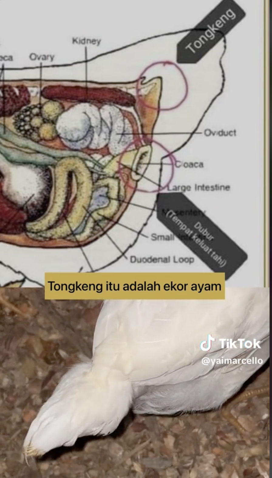 Bagi ayam, buah pinggangnya terletak pada bahagian tulang belakang haiwan berkenaan. Malah, lelaki itu siap menunjukkan satu gambar yang memaparkan najis ayam.