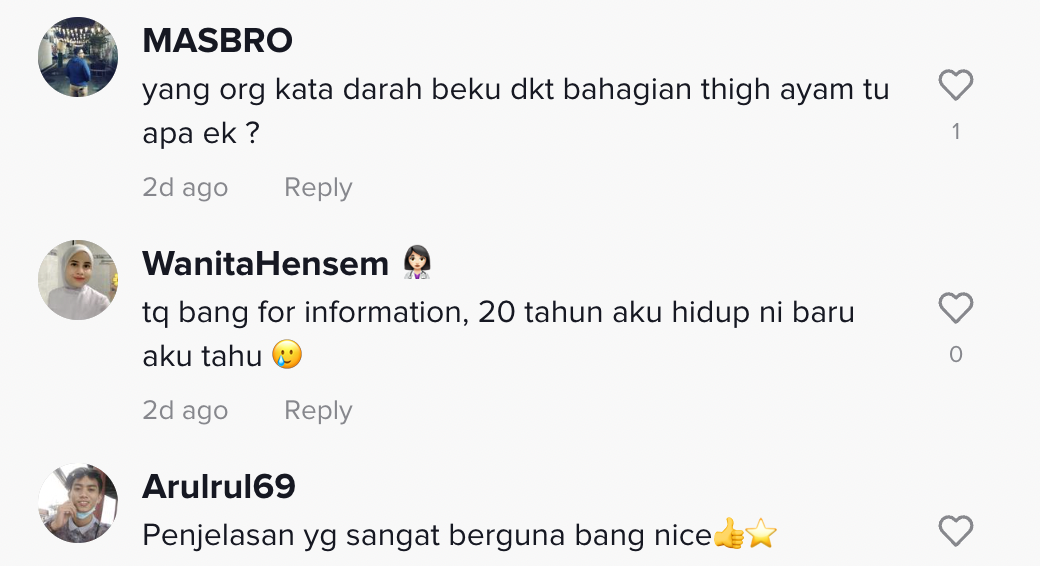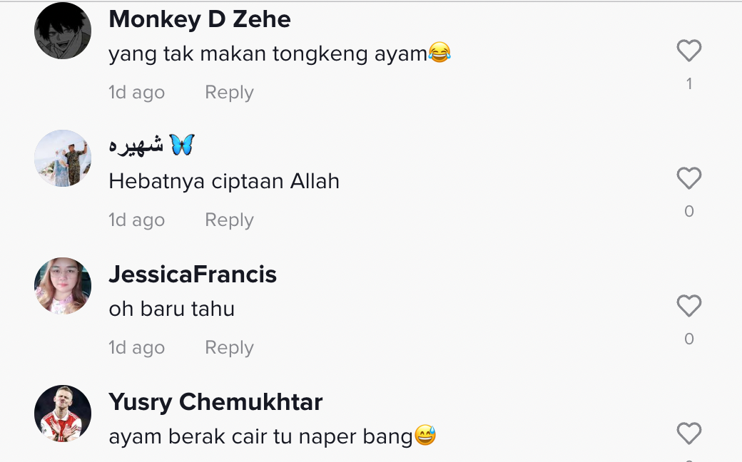 Dia berkongsi bahawa tongkeng ayam sebenarnya adalah bahagian ekor ayam (bishop nose). Difahamkan, ayam hanya memiliki satu lubang sahaja yang digunakan untuk membuang bahan-bahan yang tidak diperlukan.