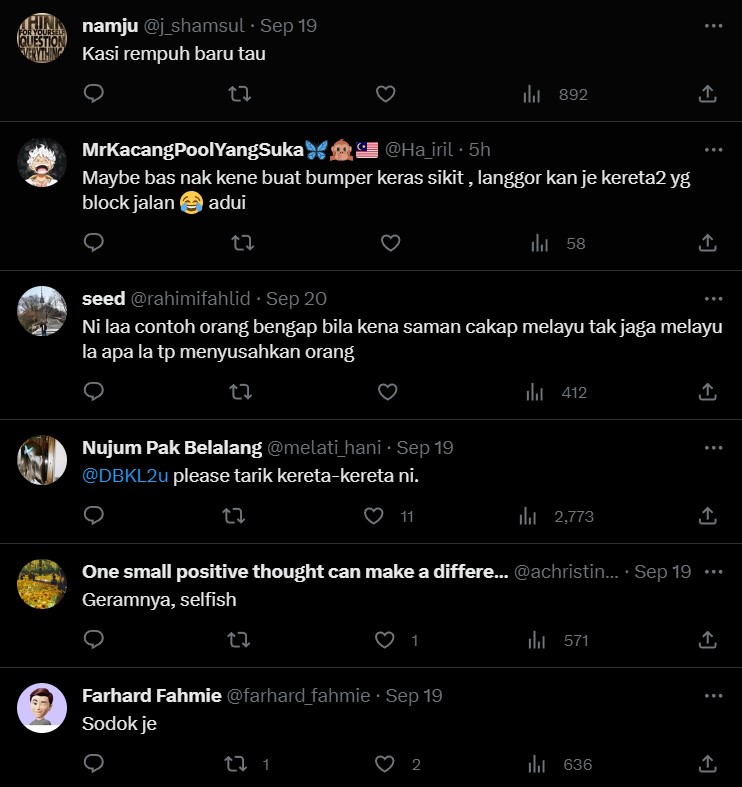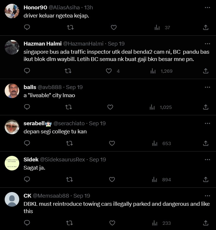 Menerusi kapsyen yang ditulis pada hantaran Twitter itu, kejadian berkenaan berlaku di Jalan Hang Lekiu, Kuala Lumpur dan sebuah kereta telah memarkir di atas lintasan pejalan kaki menyebabkan bas itu tidak muat untuk memasuki simpang tersebut.
