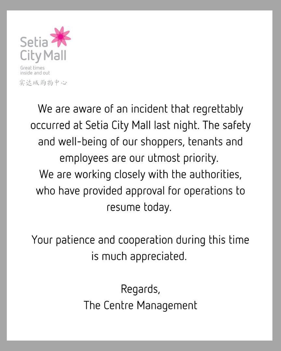 "Kami menyedari insiden yang malangnya telah berlaku di Setia City Mall pada malam tadi.