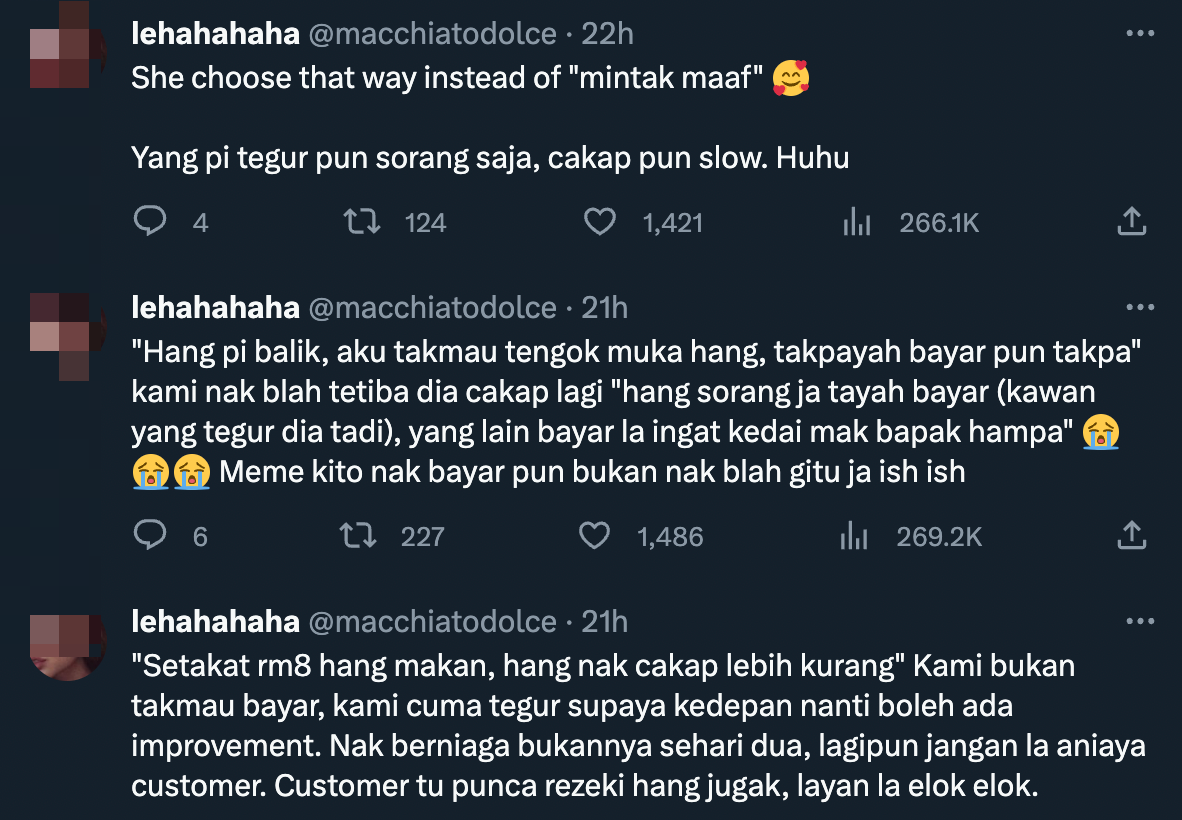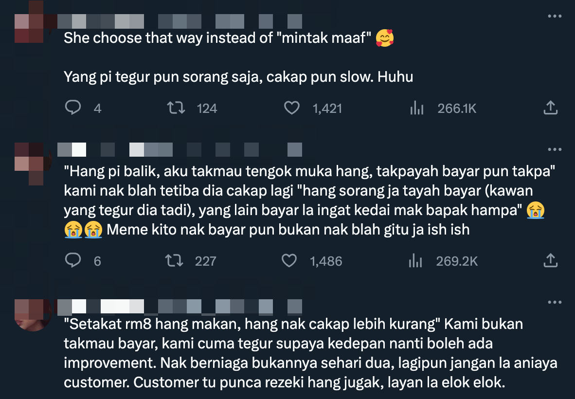 "Lain kali layan customer elok-elok na," tegur wanita itu.