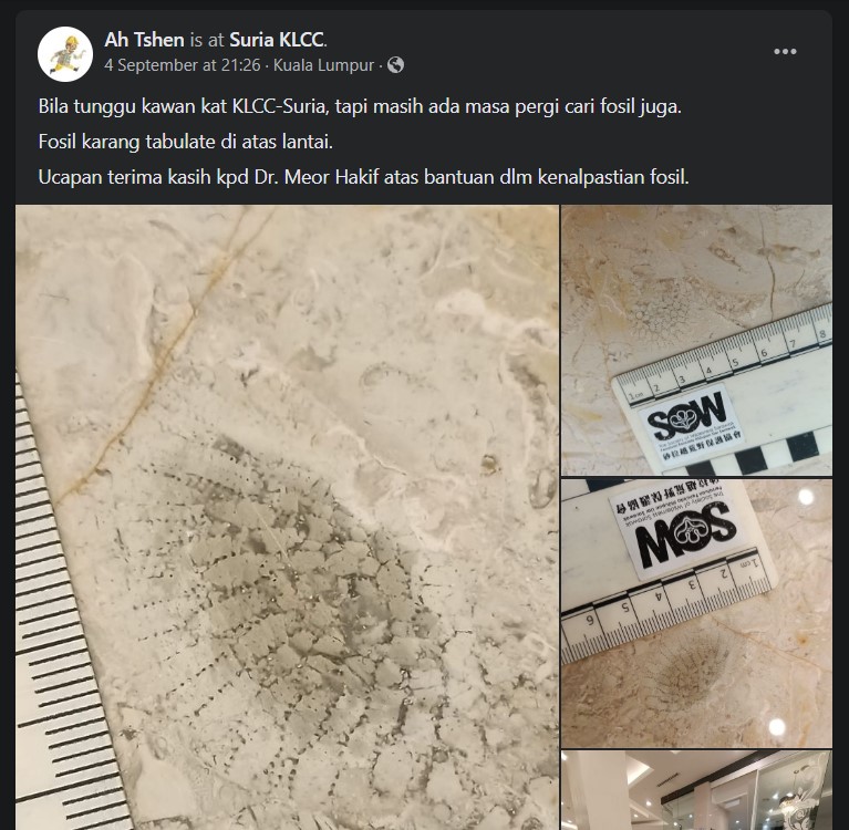 Menerusi hantaran yang dihantar oleh Ah Tshen di Facebook, lelaki itu sempat mencari fosil di Suria KLCC. Fosil yang ditemui itu adalah fosil karang tabulate dapat dilihat di atas lantai pusat beli belah tersebut.