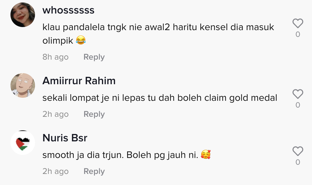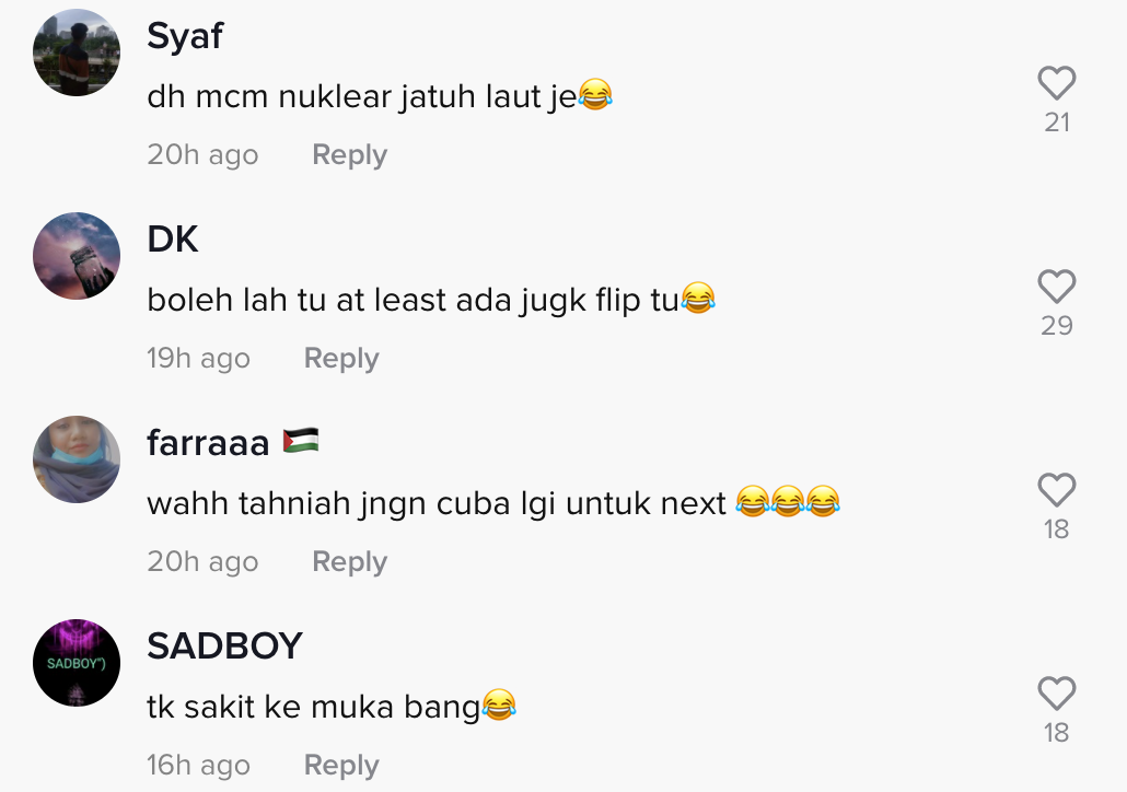 Dalam pada itu, tinjauan di ruangan komen mendapati rata-rata netizen turut merasa terhibur melihat aksi lelaki tersebut membuat terjunan.