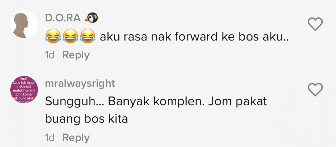 Tinjauan di ruangan komen mendapati rata-rata netizen turut terhibur dan menyokong bebelan lelaki tersebut berkenaan bos yang sepatutnya berhenti kerja.