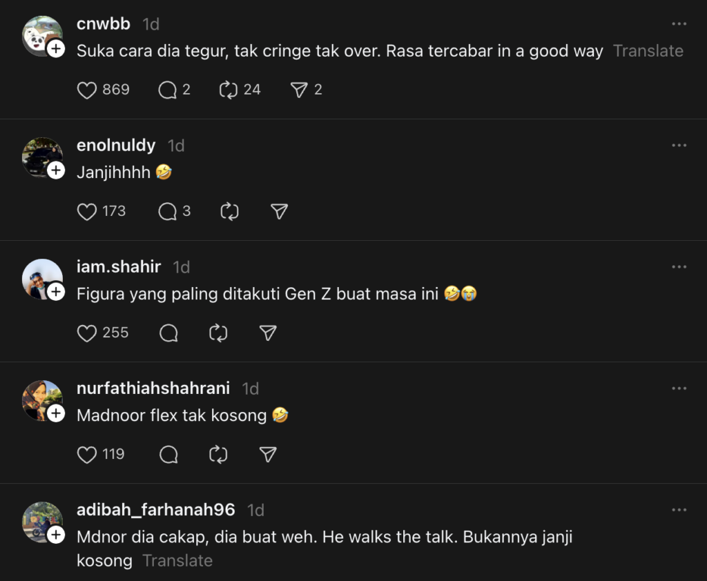Dalam pada itu, video-video Mdno juga diterima baik oleh pengguna media sosial lain dan ada yang menyokong kontennya menegur golongan Gen Z itu