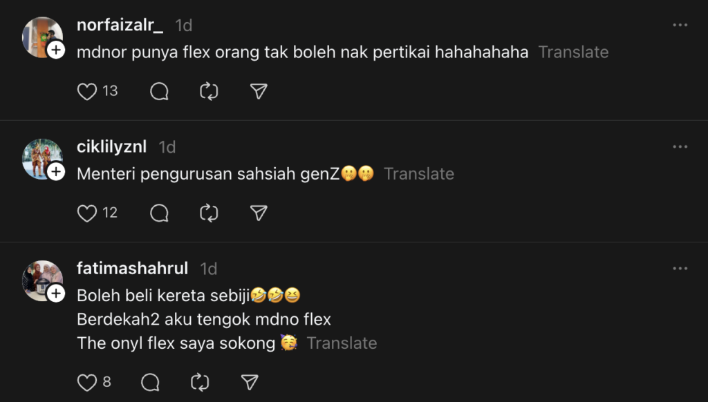 Susulan tularnya video beliau, ramai Gen Z turut membuat konten gurauan apabila mereka membeli barangan mahal seperti perfume, makeup, kereta dan macam-macam lagi. Mdno pula tidak melepaskan peluang membalas balik video mereka.