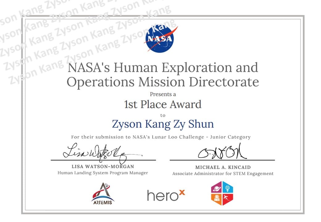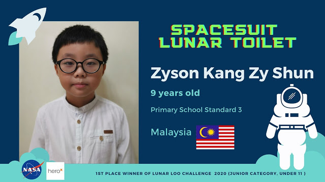 Dia yang berasal dari Shah Alam, Selangor itu telah telah dinobatkan sebagai pemenang tempat pertama NASA's Lunar Loo Challenge bagi penyertaan umur di bawah 11 tahun.