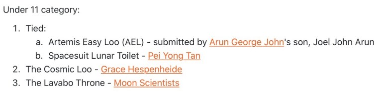 Pertandingan itu diadakan bagi mencari konsep baru mereka cipta tandas bagi misi membawa semula angkasawan ke bulan yang akan diadakan pada tahun 2024 nanti.