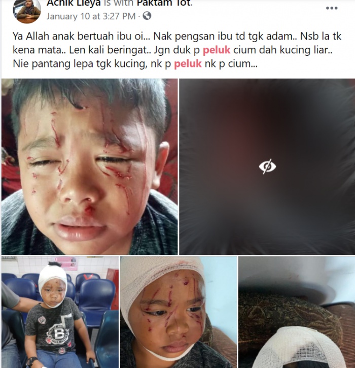Tular baru-baru ini beberapa keping gambar yang dimuat naik di laman Facebook menunjukkan seorang kanak-kanak lelaki yang wajahnya dipenuhi dengan cakaran kucing liar.