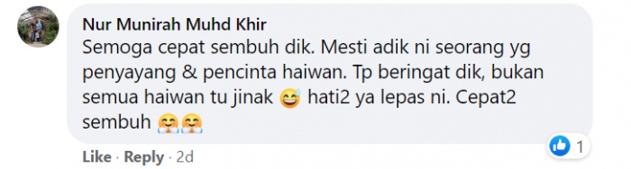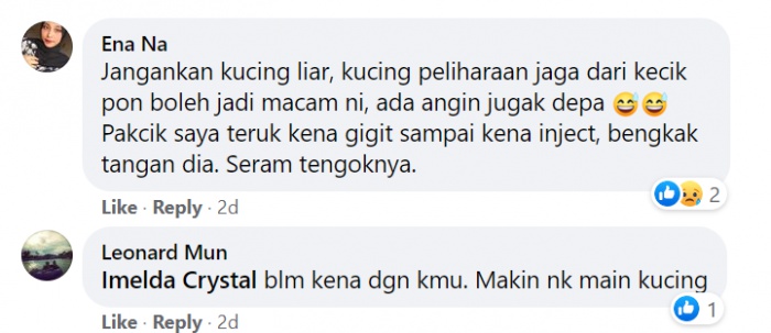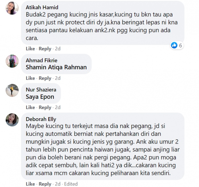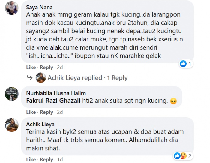 "Anak bertuah sungguh, walaupun muka dah teruk kena cakar dek kucing, Adam tetap nak sayang kucing juga. Walaupun sakit tetap punya kasih sayang pada kucing," katanya.
