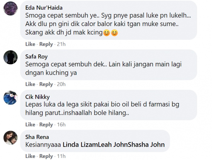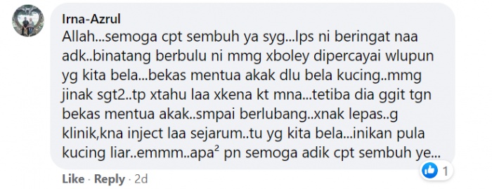 Malah, kejadian itu sedikit pun tidak membuatkan dia benci terhadap haiwan itu. Menerusi sebuah posting oleh ibunya, dia dilihat sedang memberi makanan kepada kucing-kucing itu walaupun dirinya dalam keadaan sakit.