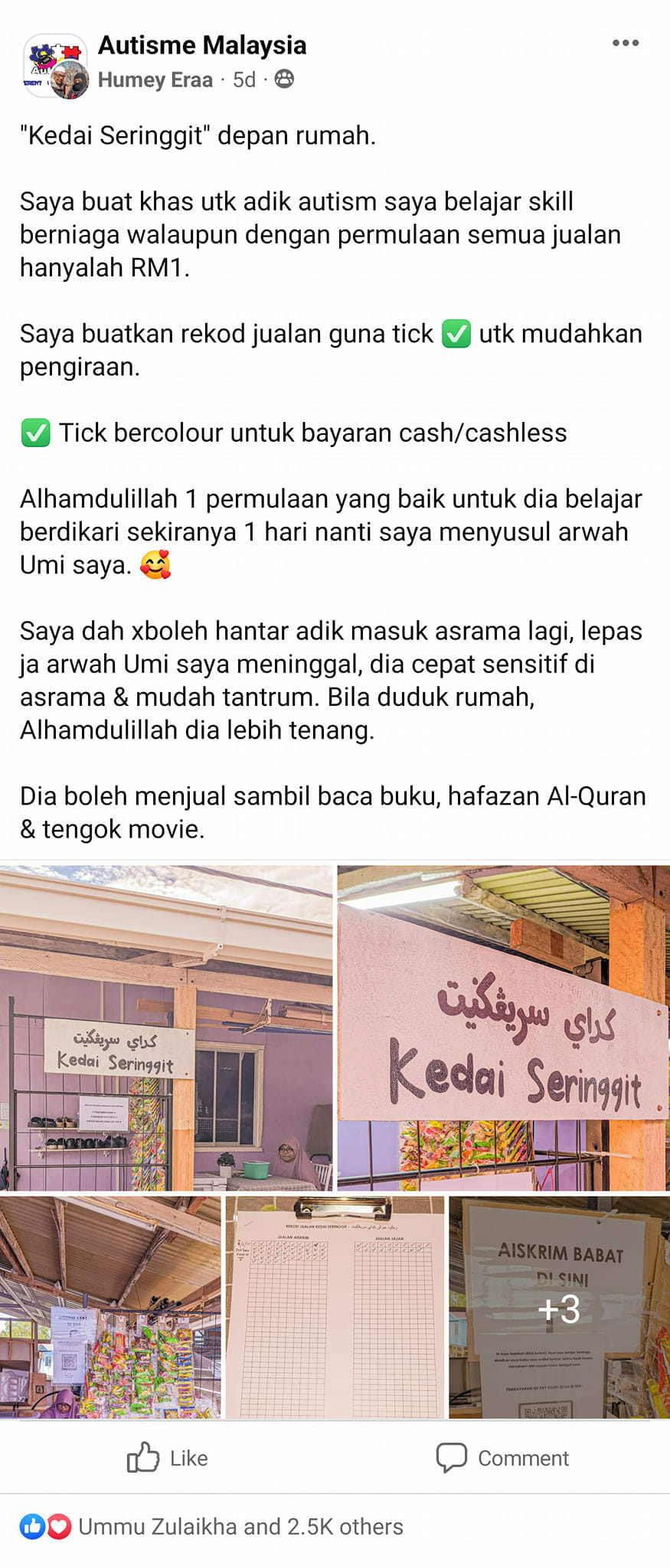 Malah, wanita berkenaan telah memberi peluang kepada adik istimewanya untuk berdikari dengan membuka premis jualan makanan ringan diberi nama Kedai Seringgit. Ia sudah mula beroperasi sejak 10 Jun lalu.