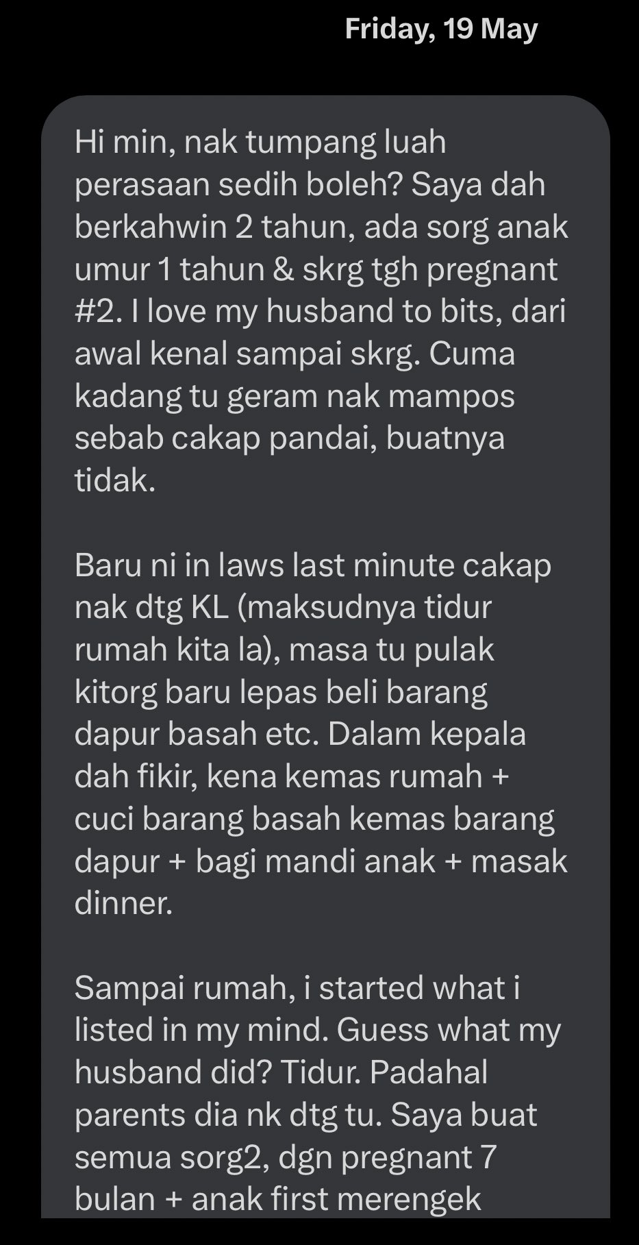 Namun, apa yang lebih mengecewakannya adalah suaminya itu dilihat selamba tidur tanpa menolong sebarang kerja rumah membuatkan dia terpaksa melakukannya sendiri. Tambahan pula dia sedang mengandung.