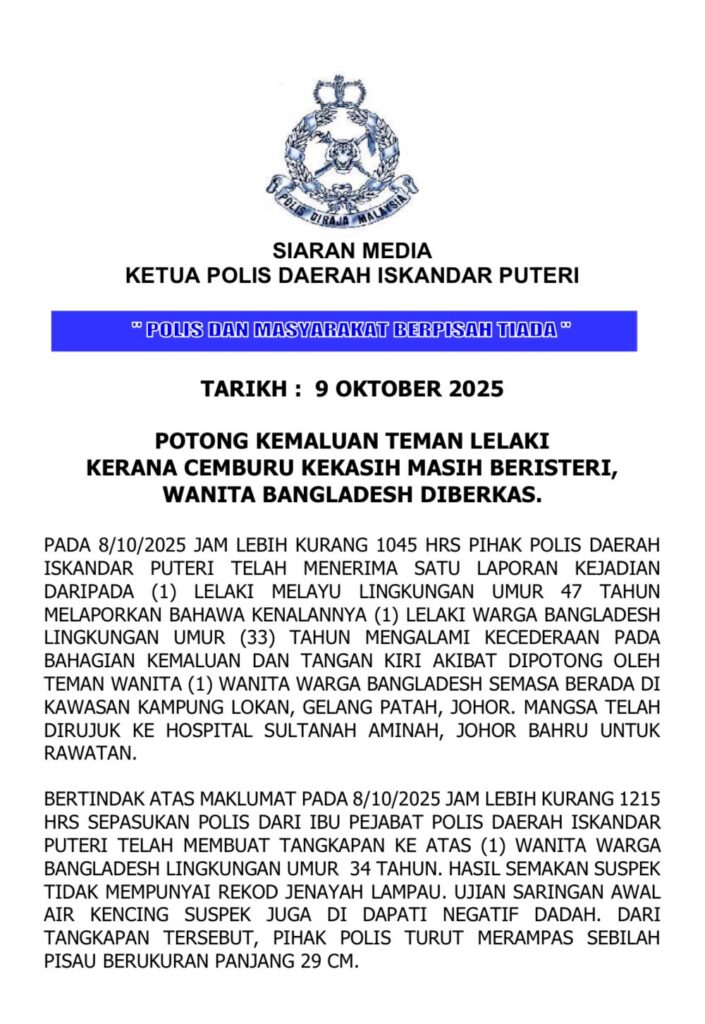 "Laporan dibuat lelaki tempatan memaklumkan kenalannya, seorang lelaki warga Bangladesh berusia 33 tahun cedera pada bahagian kemaluan dan tangan kiri akibat dipotong oleh teman wanitanya di Kampung Lokan, Gelang Patah di sini.