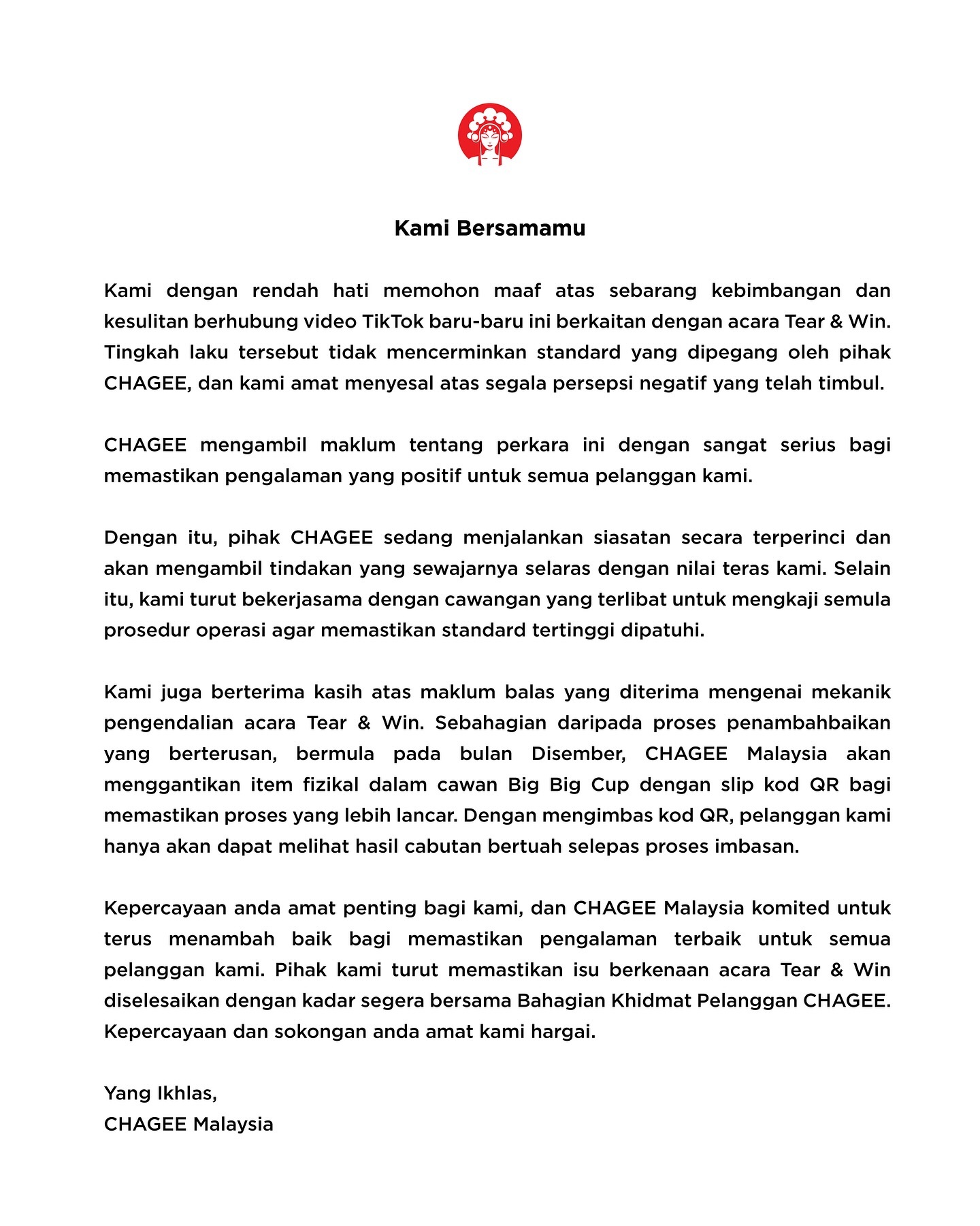 "Kepercayaan anda amat penting bagi kami dan CHAGEE Malaysia komited untuk terus menambah baik bagi memastikan pengalaman terbaik untuk semua pelanggan kami. Pihak kami turut memastikan isu berkenaan acara Tear & Win diselesaikan dengan kadar segera bersama Bahagian Khidmat Pelanggan CHAGEE," tambahnya.