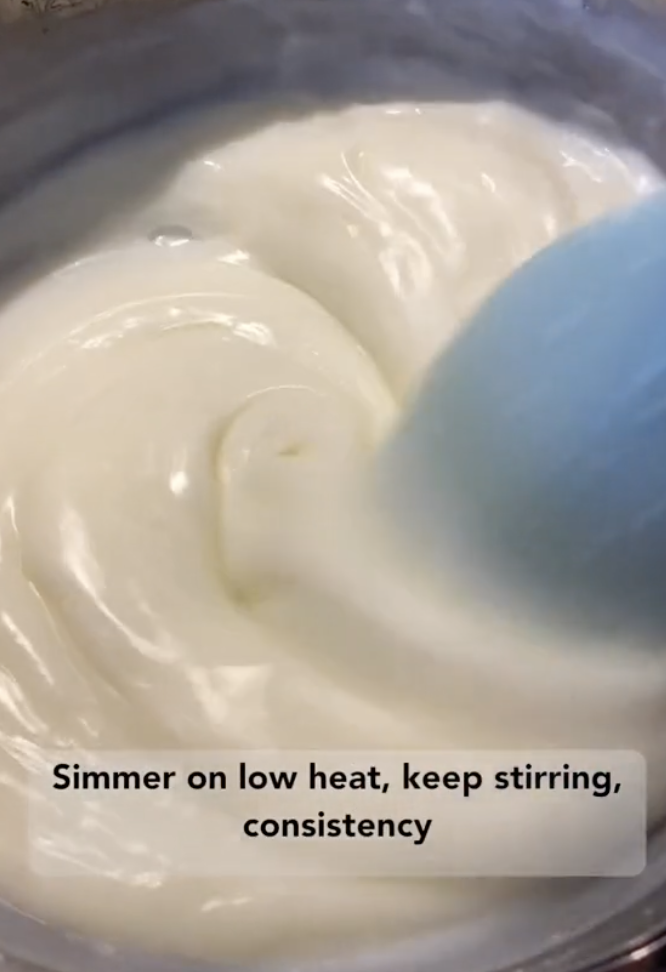 2. Renehkan campuran susu, gula dan tepung jagung tadi pada api yang sederhana. Teruskan kacau sehingga ia menjadi tekstur seperti di dalam gambar.