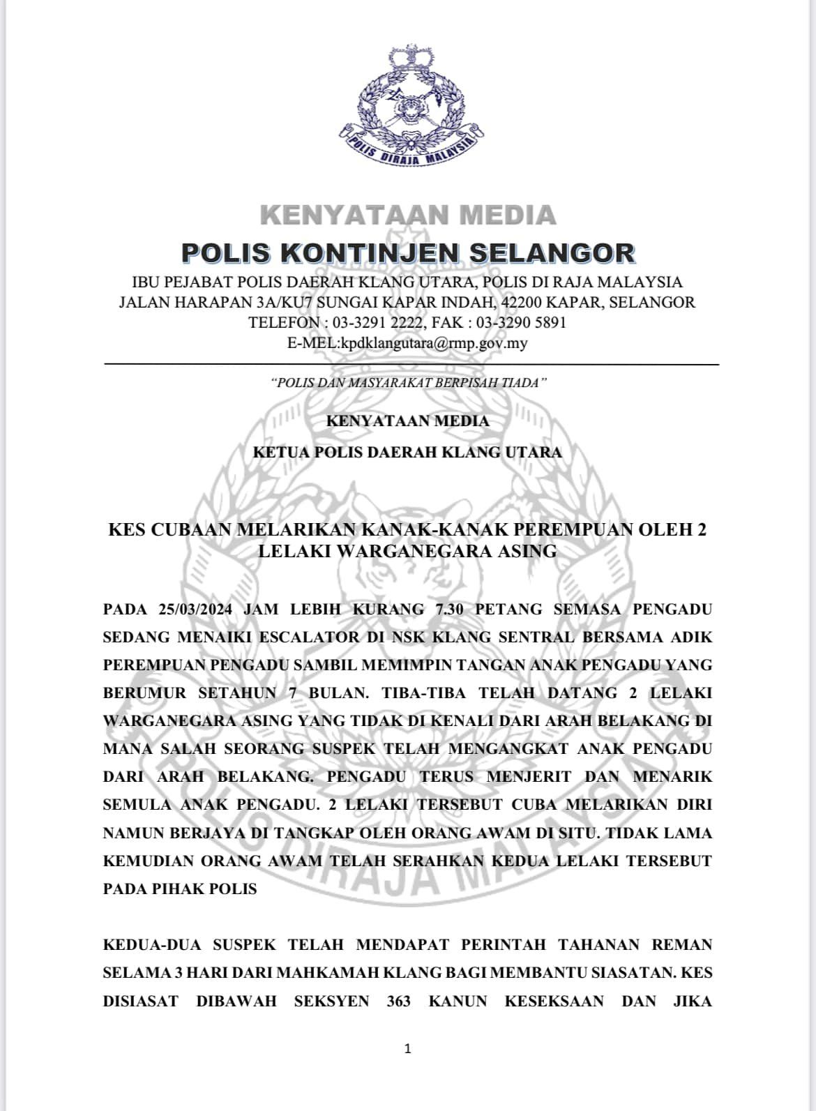 Cubaan Warga Asing Culik Budak Di NSK Klang Sentral Gagal, Orang Awam Bantu Tangkap Suspek