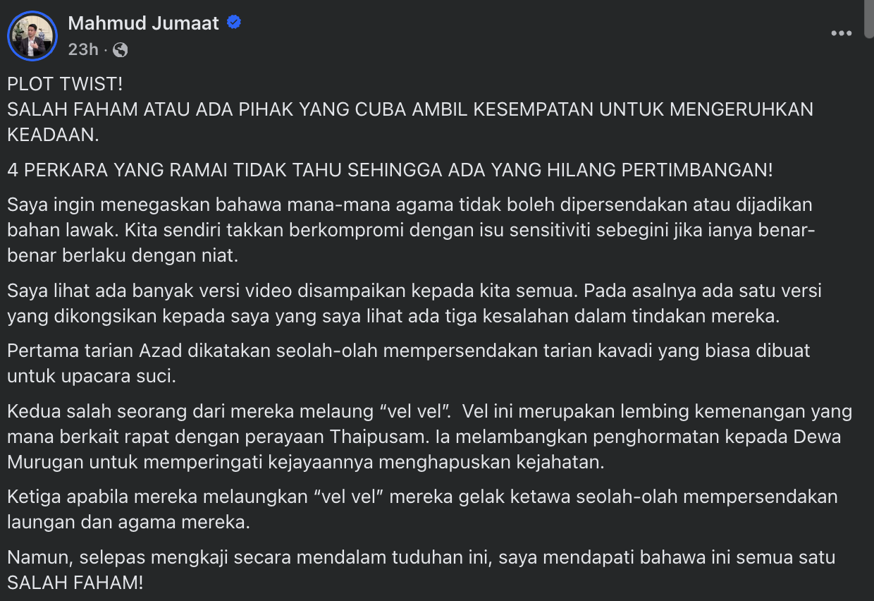 Tidak terkecuali dengan seorang peguam bela, Mahmud Jumaat. Menerusi hantaran di Facebooknya, beliau menyatakan sebenarnya ini semua hanyalah salah faham dan ada pihak yang cuba mengambil kesempatan untuk mengeruhkan keadaan.