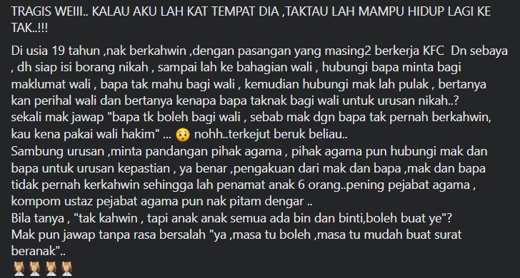 Ketika sampai ke bahagian wali, wanita tersebut menghubungi ibu bapanya tetapi mendapat berita yang mengejutkan di mana ibunya memberitahu bahawa mereka tidak pernah berkahwin.