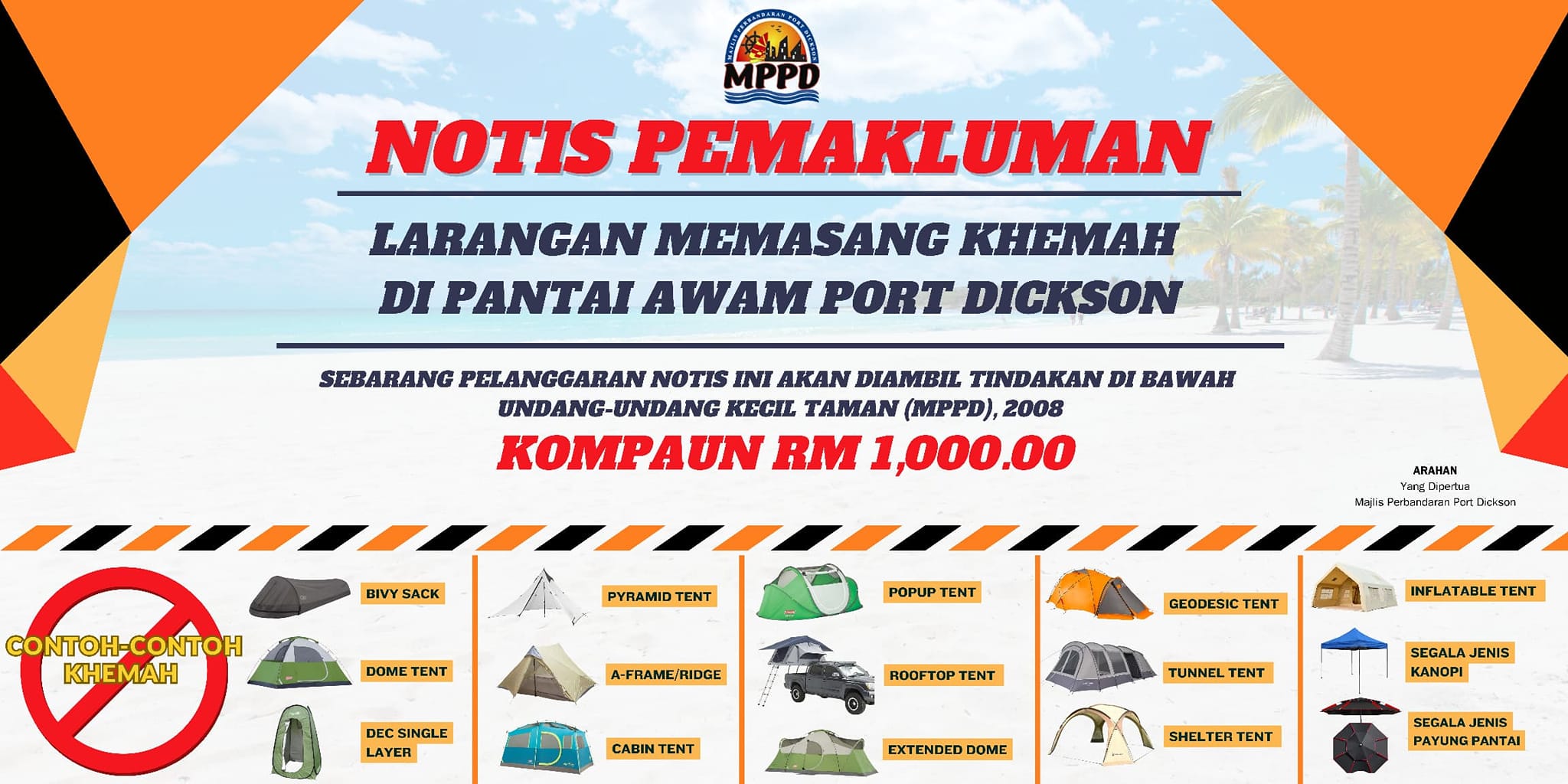 Menerusi hantaran pihak MPPD di Facebook, pihak Majlis telah menguatkuasakan larangan memasang khemah di beberapa pantai awam di Port Dickson.