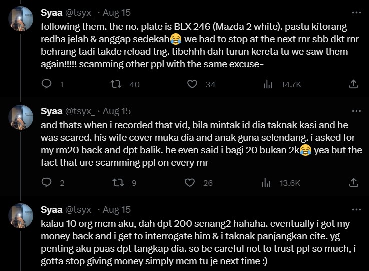 Setelah tularnya video tersebut, post telah meraih sehingga 156.7K views, 996 likes dan 1,458 reposts di Twitter.