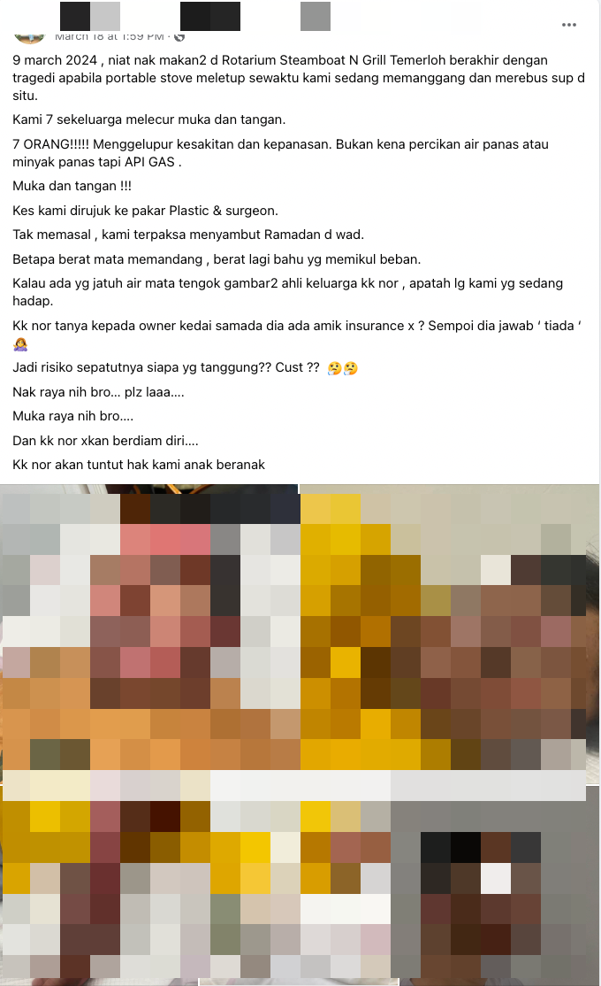 Baru-baru ini, tular apabila sebuah keluarga mengalami kecederaan teruk selepas menjamu selera di sebuah kedai steamboat.