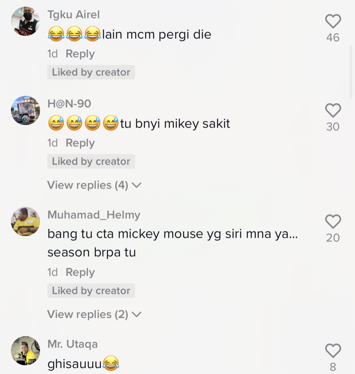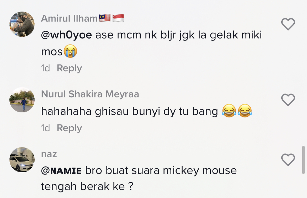 Sementara itu, tinjauan di ruangan komen mendapati rata-rata netizen turut terhibur mendengar cara pemuda tersebut mengajuk gelak Mickey Mouse.