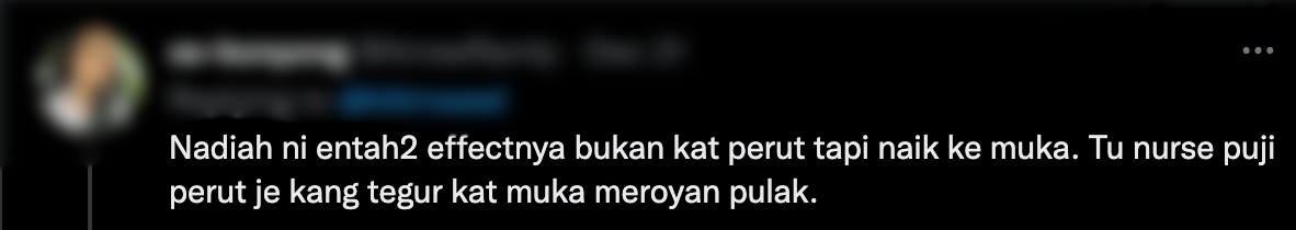 "Boleh Nadiah tahu tak kenapa ada setengah ibu selepas melahirkan anak perut mereka akan jadi macam ni? Alhamdulillah, Nadiah ada 4 orang anak perut tak ada kesan langsung macam ni, sampai bidan dan nurse semua puji dan tanya jaga macam mana, Nadiah jaga biasa je, tapi Nadiah tertanya-tanya kenapa ada setengah perut mereka jadi macam ni, kenapa ya?," tulisnya.